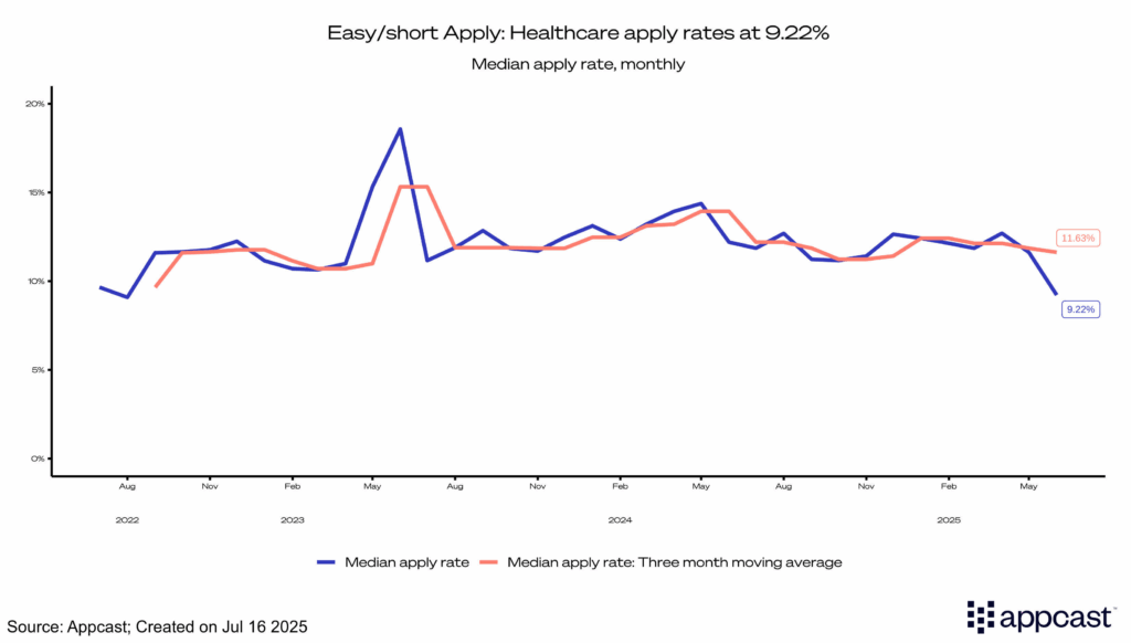 The driver behind these increases is a familiar one: declining conversion rates. Apply rates for short-apply jobs slipped another percentage point in Q2, falling from 12% to 9%. As fewer job seekers move from click to application, the cost of generating each apply rises, tightening recruitment budgets even in channels that were once considered more efficient.