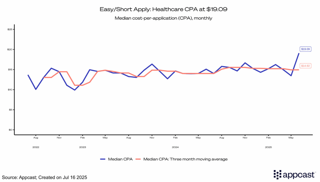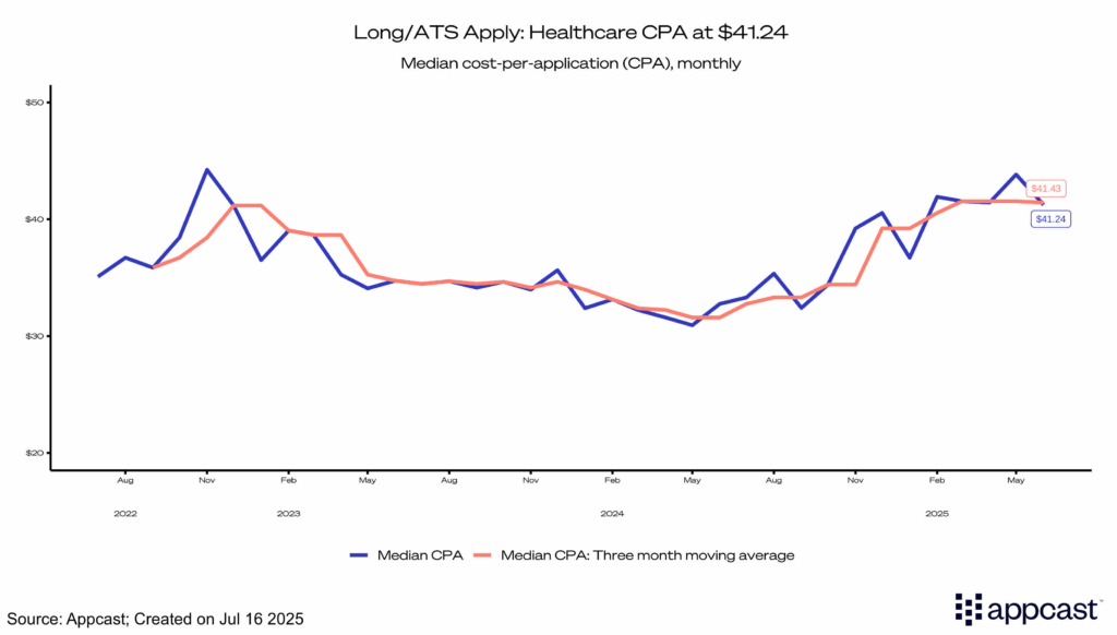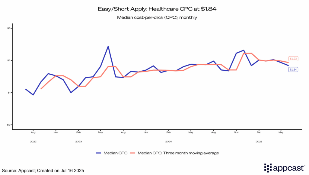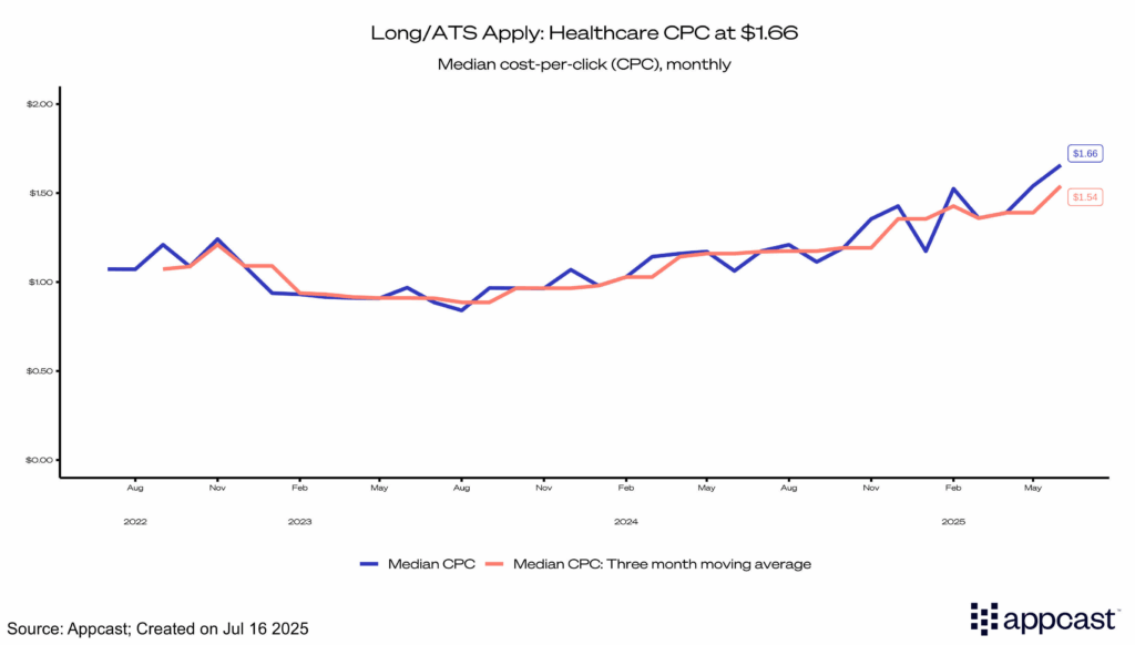 Cost-per-click (CPC) for healthcare job ads rose to $1.66, an all-time high, while cost-per-application (CPA) climbed past $41, the highest level in over two years. This surge is being fueled by unrelenting demand for critical roles such as mental health workers, behavior analysts, and home health aides.
