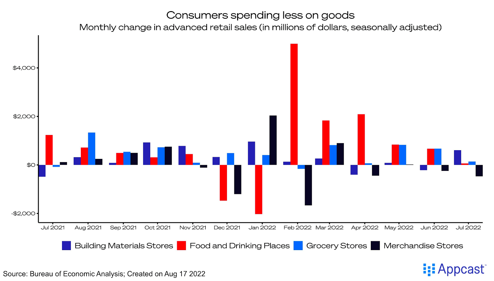 Consumers continue to shift their spending from goods to services, but spending at food and drinking places increased 0.1% in July. Meanwhile, spending at grocery stores rose 0.2%. Prices for food at home increased 13.1% from a year ago in July, and prices for food away from home increased 7.6% in the same period.