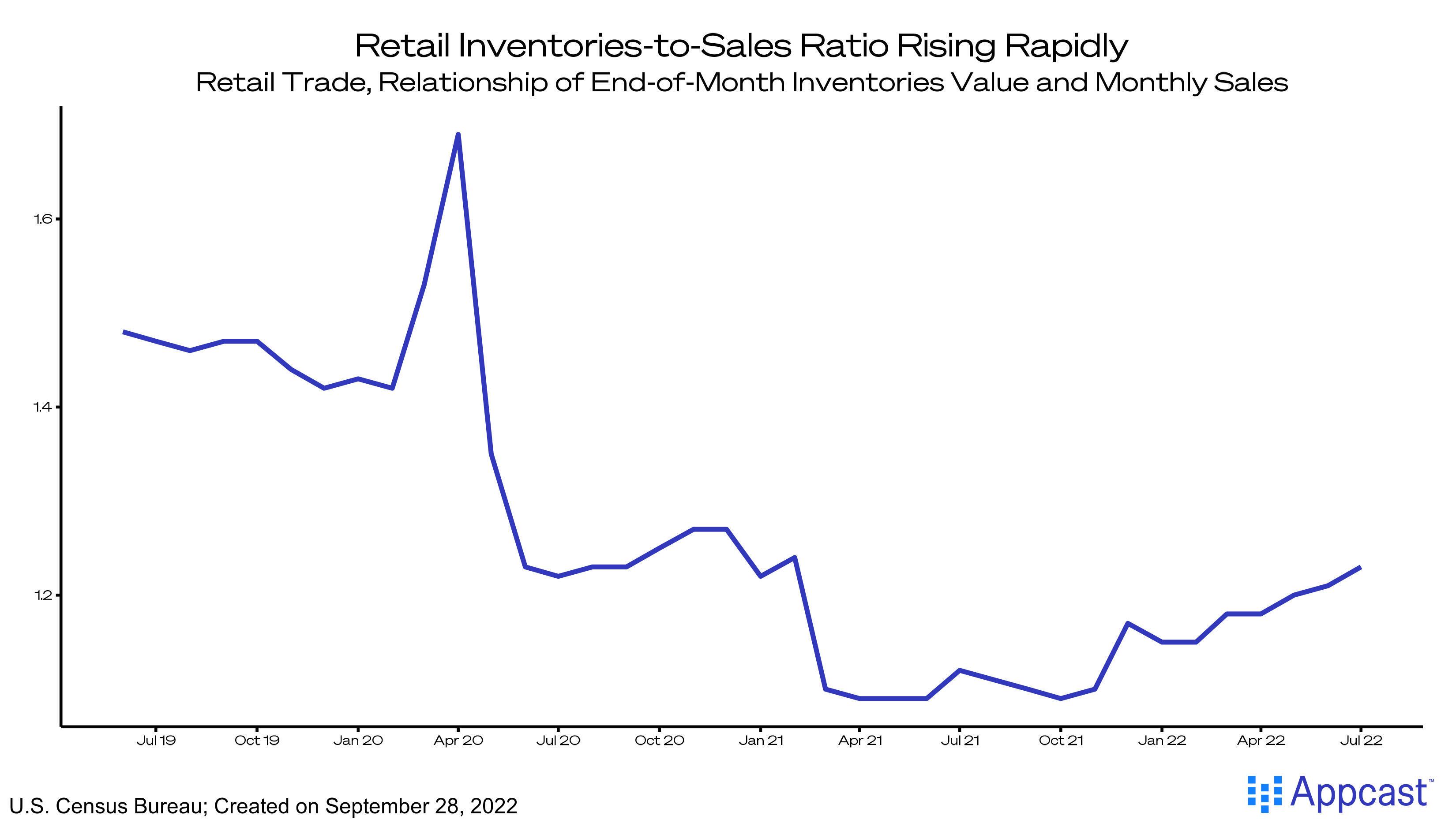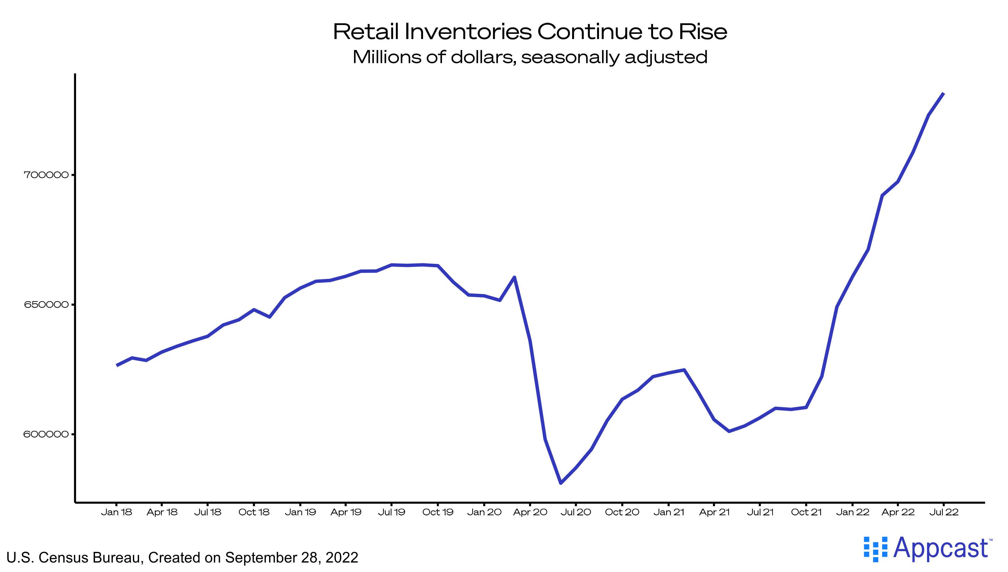 The retail inventories-to-sales ratio – a measure of how long inventory will last at the current sales pace – is, historically speaking, fairly low, at just 1.23 in July (normally, retailers aim for around 1.5). However, it has been climbing steadily, indicating that retailers are at risk of an overwhelming bloat if they miscalculate consumer demand this season. As economic uncertainty rapidly increases, retailers will need to proceed with caution.