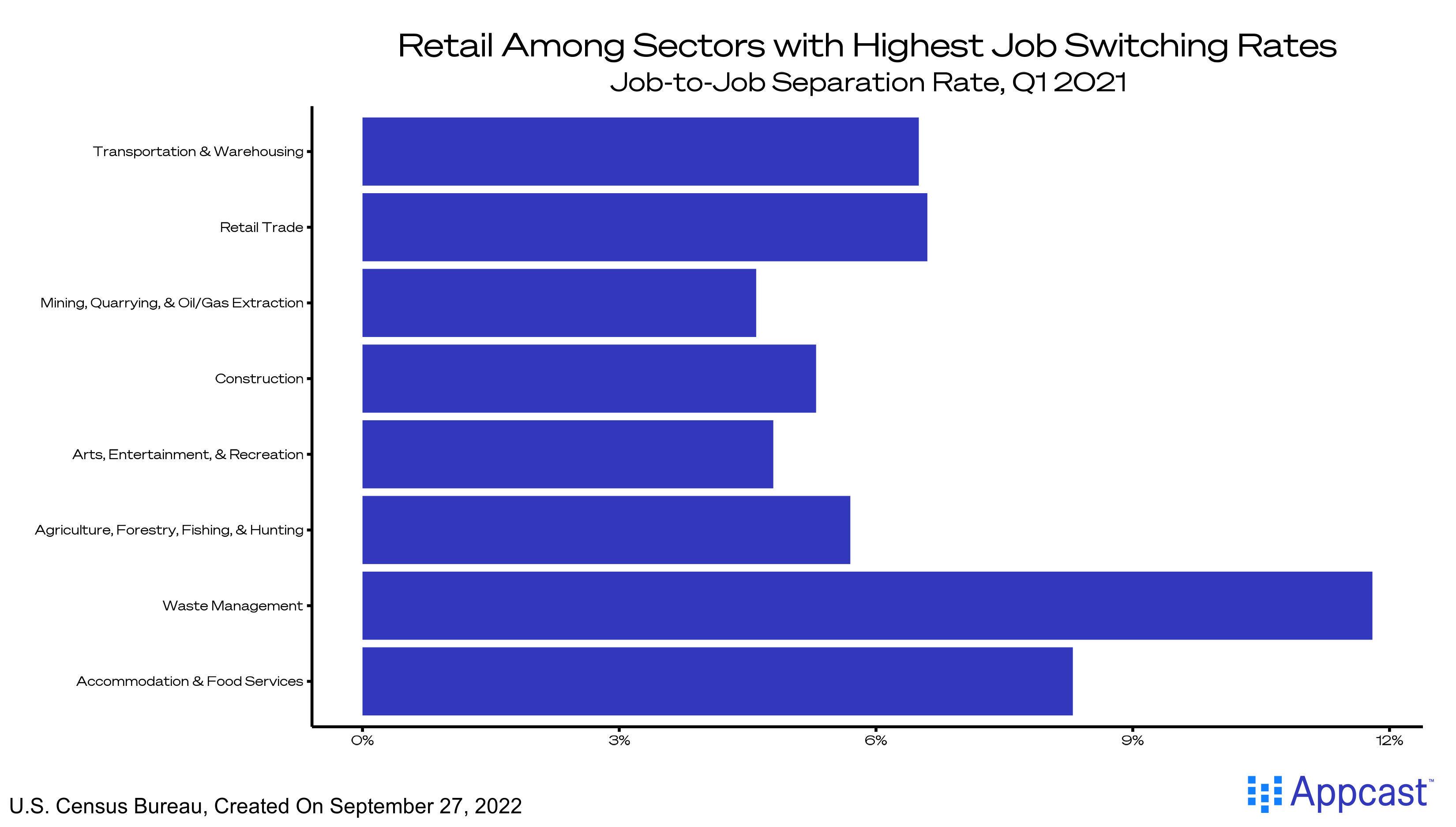 Retail workers are industry-flexible: in Q1 of 2021 (the latest job-to-job separation data available), the job separation rate in the sector was 6.6%. Seasonal job seekers that would normally look for retail work, then, probably have the transferable skills to consider other industries. Reduced demand in a leading hiring sector should be welcomed news for other (seasonal) employers.