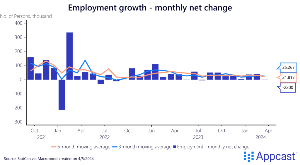 In a shift from the recent trend of a steadying labor market, Canada’s job market experienced a setback in March, shedding 2,220 positions. This decline follows two months of robust employment gains. Despite the setback, the longer-term outlook remains positive, with an average of 21,000 jobs added each month over the past six months.