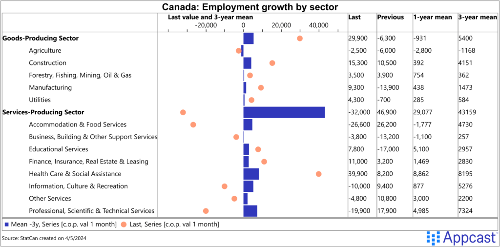 In an unexpected turn of events, the goods-producing sector added 29,900 new jobs after many months of negative growth. On the other hand, the service-producing sector (think hotels, restaurants and healthcare) experienced a significant contraction of 32,000 jobs, concentrated in the accommodation and food services industry.