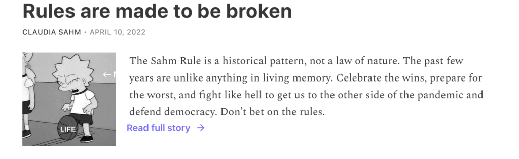 Since this measure has been triggered in every major (U.S.) recession since 1949, many have taken it to be a definite recession indicator. But even Claudia reminds us that rules are made to be broken – and the current economic situation is far from normal.