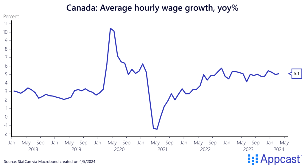 Despite a softening labor market, wage growth in Canada just won’t quit. Average hourly earnings were up 5.1% year-over-year, which has remained consistently high since 2022. The average number of hours worked was unchanged last month, but has increased by 0.7% over the past year, a welcome sign that part-time workers are getting the hours they need.