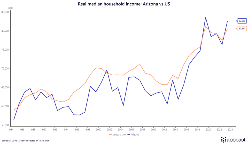 More recently, though, the state’s economy has outperformed. Some of the difference can be explained by the significant population growth Arizona has experienced thanks to its positive migration balance. Median household income has caught up and is now slightly exceeding the U.S. average.