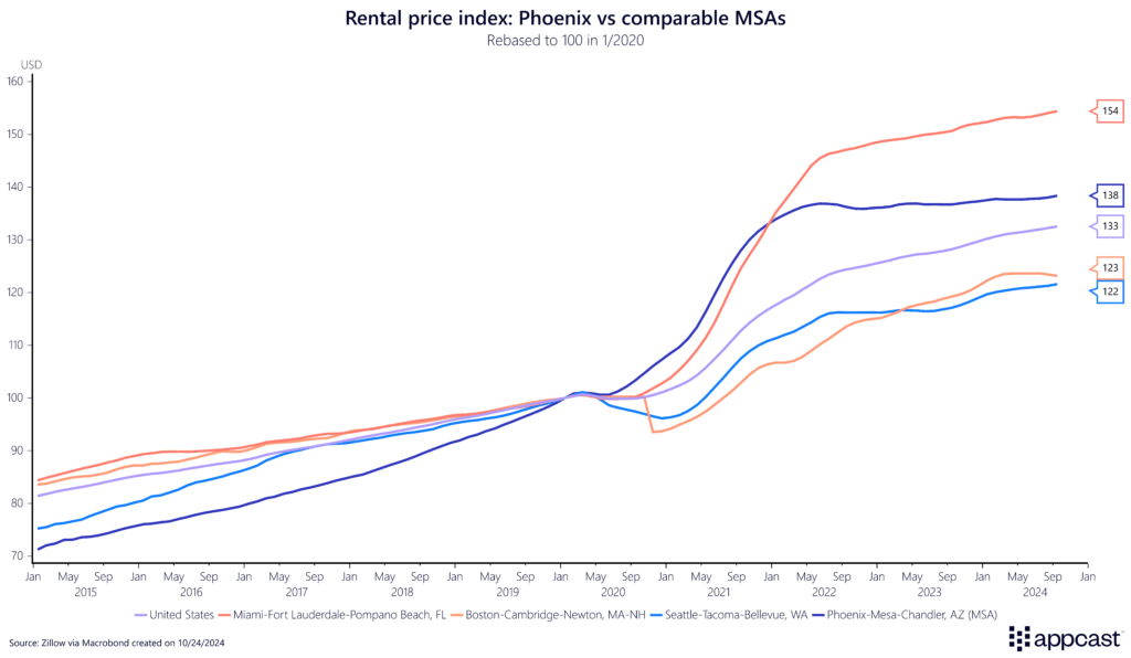 Rental prices in the Phoenix metropolitan statistical area (MSA) surged significantly faster between 2020 and early 2022 compared to many other MSAs of similar size like Greater Boston or Seattle.