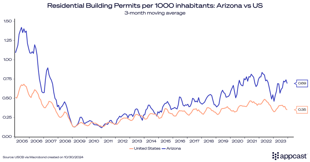 Edit (Wednesday, October 30th): A previous chart on residential building permits in Arizona vs the U.S. has been changed to reflect population.