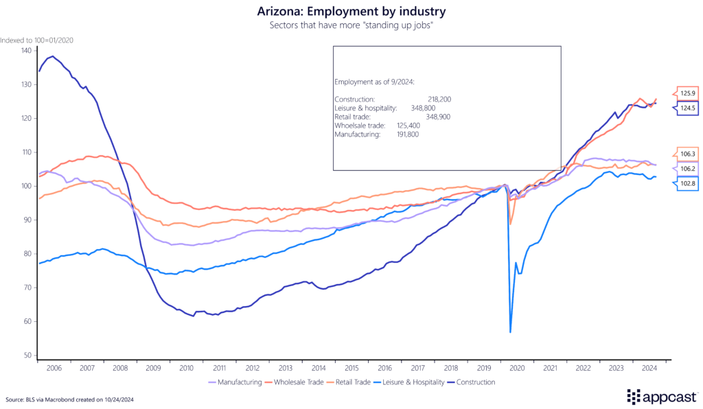Employment across most industries has been steadily increasing in recent years, as one would expect in a growing state. However, there are some key sectoral differences. Sectors that have more “standing up” jobs (think, blue-collar) are thriving, while sectors with more “sitting down” jobs (think, white-collar) are seeing smaller gains.