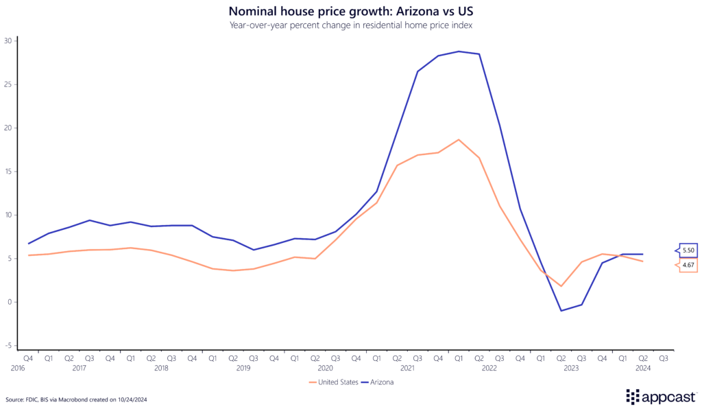 Nevertheless, house price growth has significantly outpaced the rest of the U.S., especially in 2021 and 2022. The main reason is that Arizona’s economy has outperformed the United States overall, therefore attracting a continuous inflow of workers from the rest of the country.