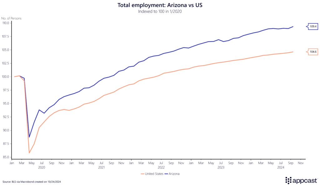 Arizona is also currently enjoying one of the strongest labor markets in the country. Since early 2020, job growth has increased by about 9% compared to only 4.4% for the U.S.