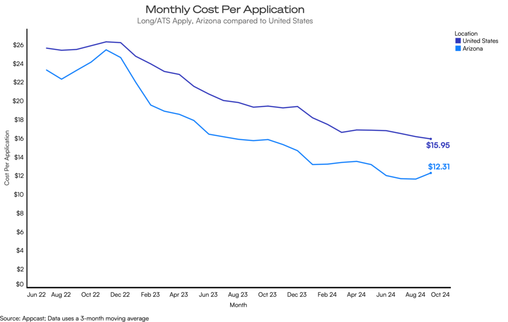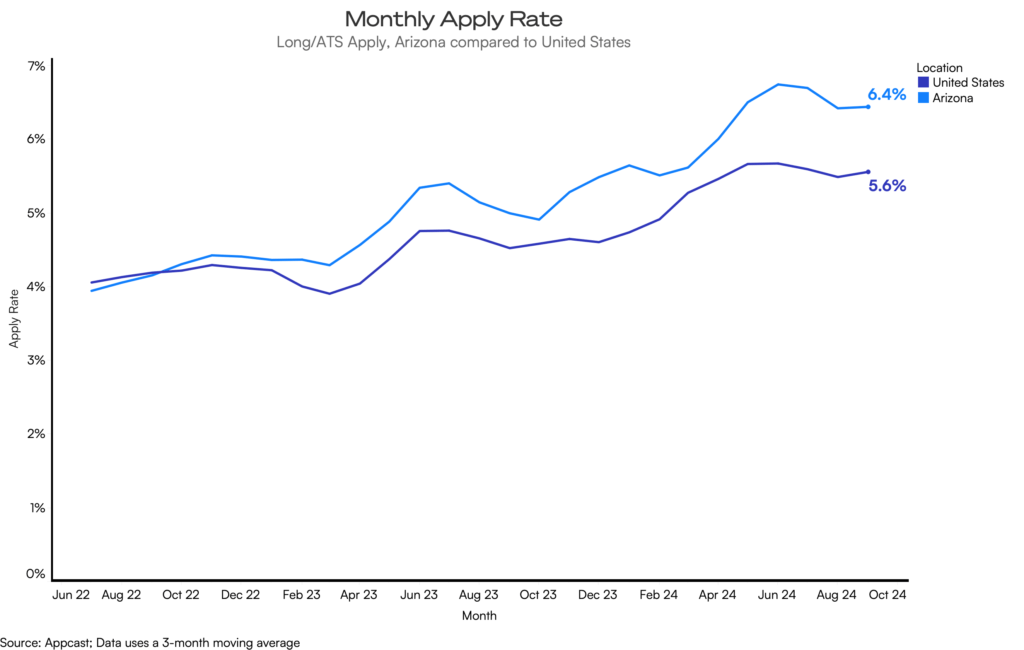 Arizona offers strong potential for recruitment, thanks to its lower cost-per-application and higher job seeker activity (apply rates). Recruiters in fast-growing sectors like construction and retail can leverage a larger talent pool, though they may encounter increased competition as the state’s labor market continues to expand.