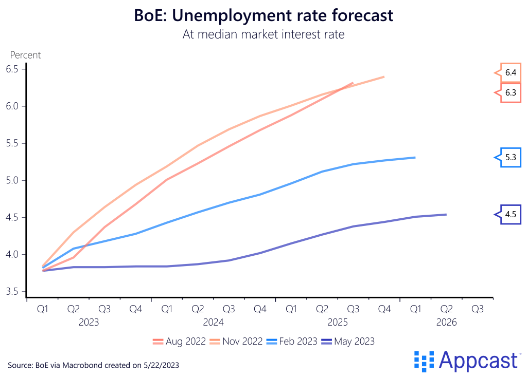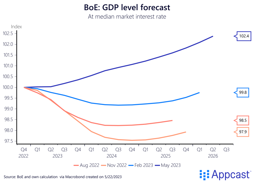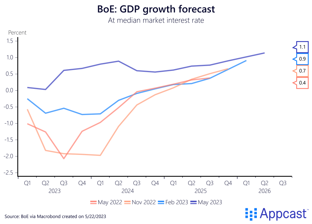In conjunction with the previous rate hike, economic forecasters at the BoE substantially revised up its short-term and medium-term projections for the U.K. economy. In its latest projection based on future market interest rates, the BoE now expects the economy to grow this year and also has revised up expectations for GDP growth throughout 2024 and into early 2026.
