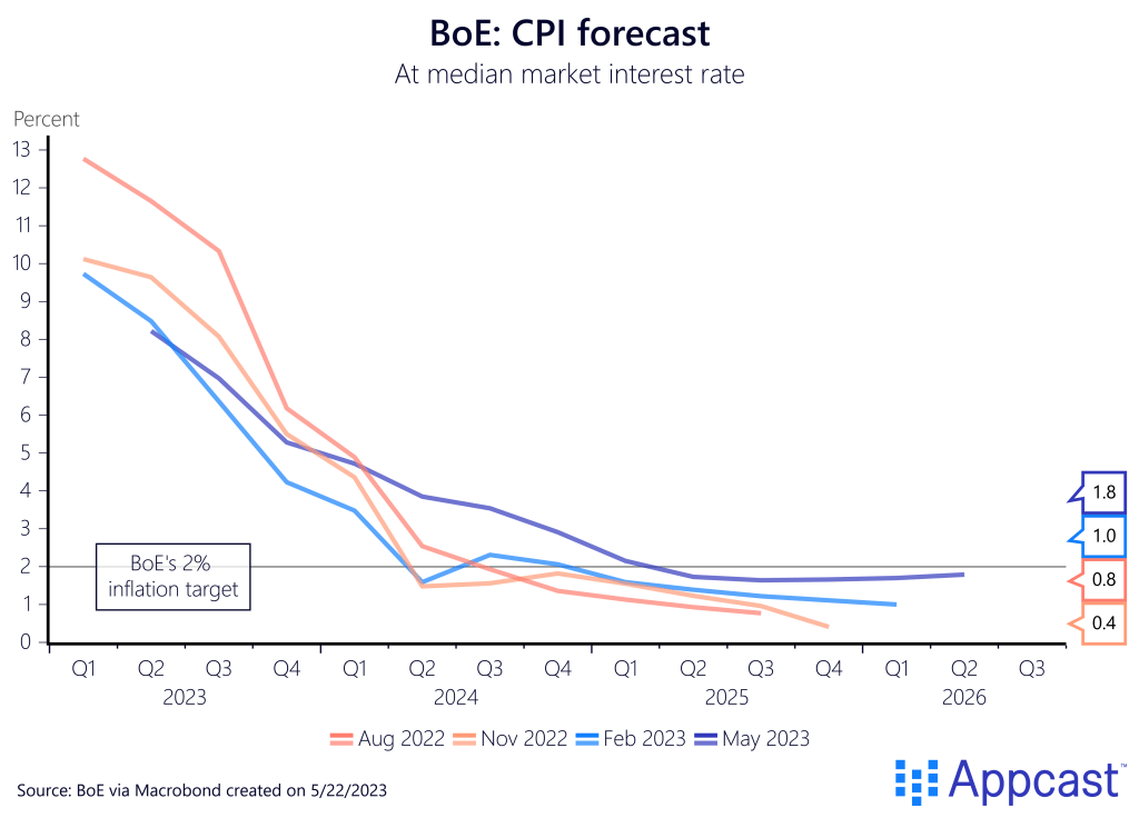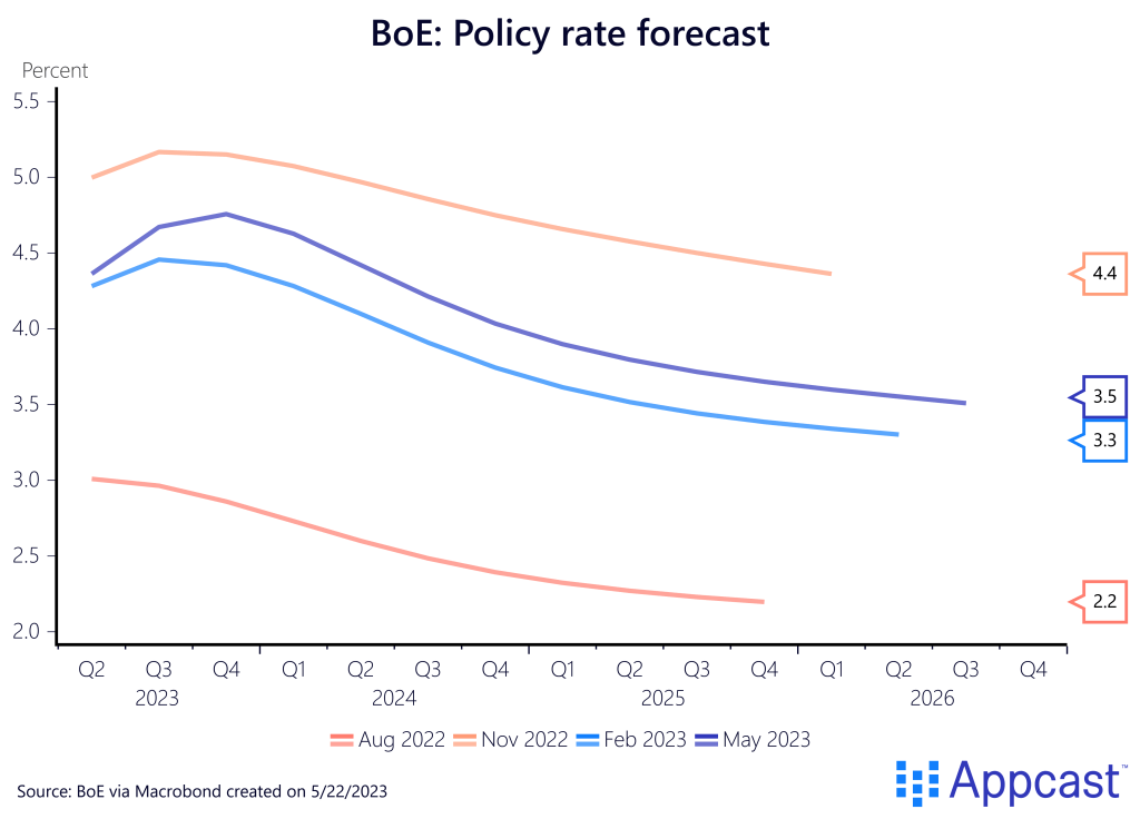 The Bank of England (BoE) hiked their policy rate to 4.5% on May 11 as the U.K. economy continues to suffer from high inflation, with consumer prices rising by more than 10% (annualized rate).