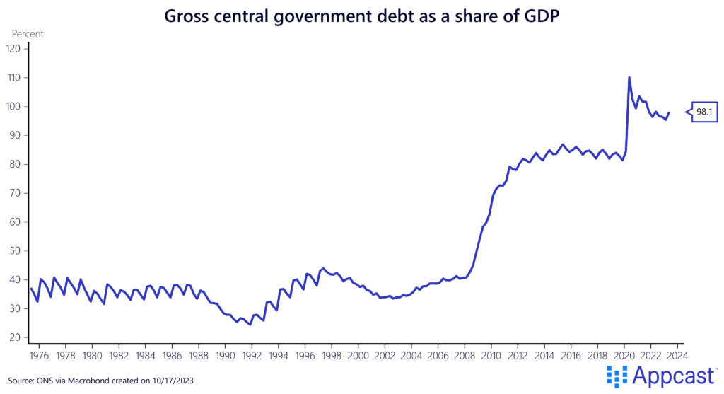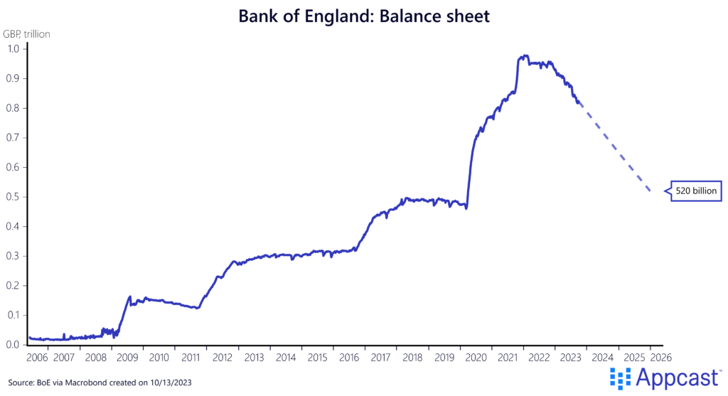 The BoE’s policy of shrinking the balance sheet will strain public finances even more. The additional money will have to come from somewhere, through a combination of higher taxes – most likely on labor income – and lower public spending, both of which will negatively affect the U.K.’s already poor growth prospects.