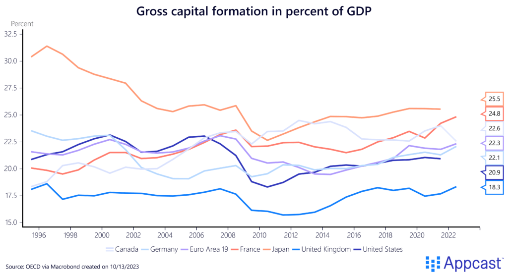 Now interest rates are rising, but the country is in desperate need of public infrastructure programs. The meager rate of gross capital formation in the U.K. in recent decades – a fancy way of saying how much money is invested in the economy – speaks volumes. Policy makers failed to take advantage of the low debt costs before COVID, and the country will now pay the price.