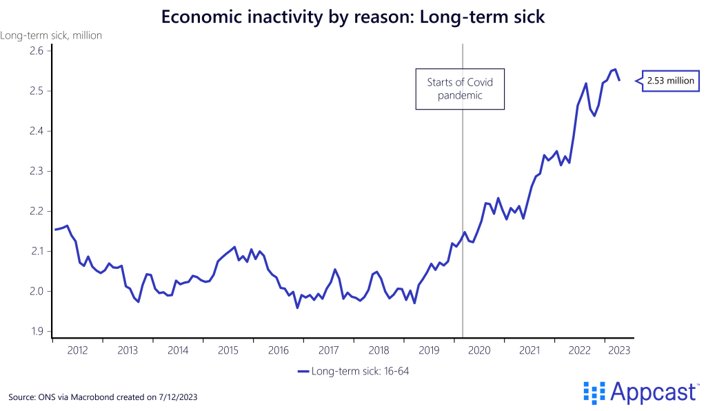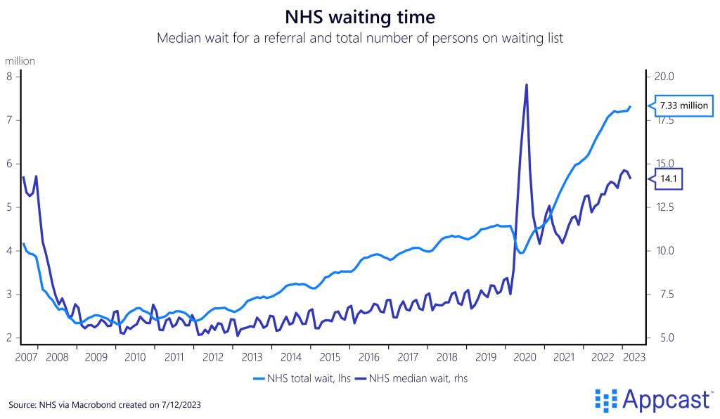 The NHS is stretched dangerously thin. Waiting times for referrals have more than doubled recent years. Though we leave it up to healthcare policy makers to suggest how to reform the system, we can note with certainty that the NHS is underfunded and needs a significant increase in budgets in the years to come. While the taxpayer would ultimately have to foot the bill, inadequate healthcare services are currently a massive burden for the entire U.K. economy that will end up costing much more. Weekly excess deaths are still running at a rate of 700 per week (or 40,000 annualized). Moreover, an additional 500,000 people are out of the workforce due to long-term health issues and working days lost to sickness have surged. This negative supply shock is adding to the U.K. inflation problem as companies have trouble filling positions, which is hurting productivity and inflating recruiting costs.