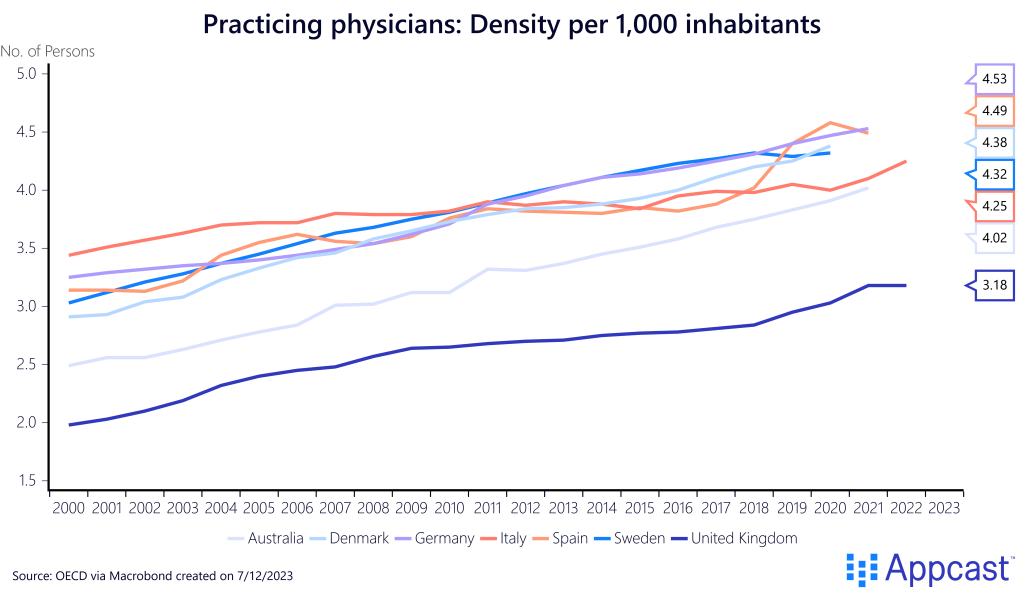 One big reason why the health care system in the U.K. is beyond capacity now is also due to the fact that physician density is particularly low compared to most other European countries. The doctor shortage is aggravated by the fact that salaries for junior doctors, especially NHS doctors, are extremely low compared to other countries like the Australia, Canada, or the U.S. In short, the NHS is underfunded, and workers are underpaid.