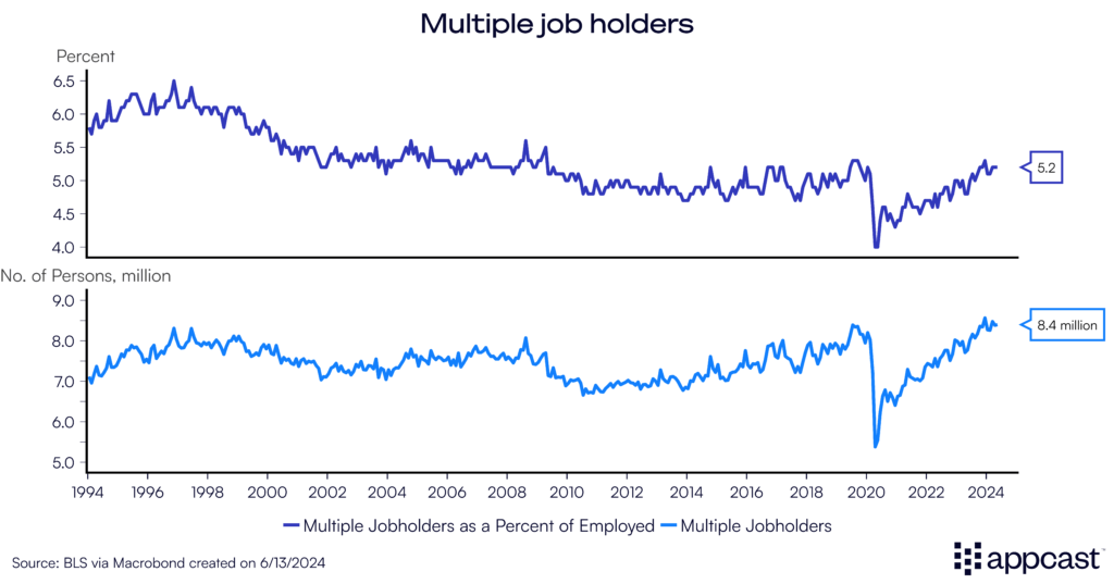 Since the payroll survey counts jobs instead of workers, some have argued that job growth is only so high because workers need to have two jobs to get by. However, labor market data shows that the percent of multiple job holders is historically low.
