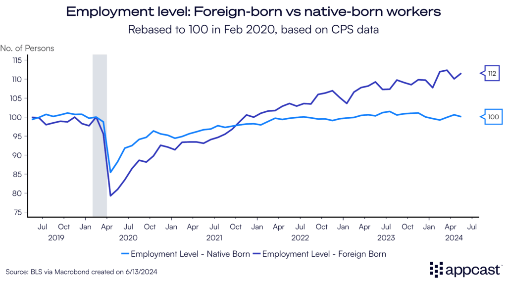 The unexpected increase in labor supply is part of the reason why the U.S. economy has outperformed other advanced economies. Even as domestic workers are leaving the workforce en masse because of aging (the Baby Boomers retirement surge has not gone unnoticed), employment growth has continued to stay positive because foreign-born workers account for most of the job creation since 2020.