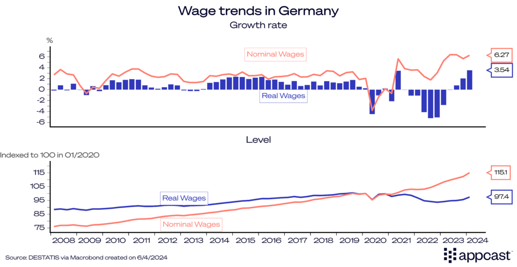 However, there are several data points that might concern European monetary policy makers in Frankfurt. Germany, the Eurozone’s largest economy (more than 25% of the region’s GDP), has seen a massive uptick in wage growth in the beginning of this year. Nominal wages surged to above 6% and real wage growth ticked up to 3.5%, the highest level in more than 15 years.