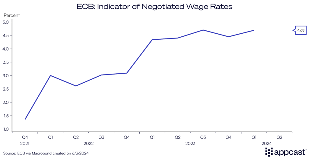 The ECB’s indicator shows that negotiated wage growth remains slightly elevated growing at a rate of more than 4%. However, this is also driven by one-off effects that will not be repeated. In Germany, for example, public sector employees received a substantial one-time inflation compensation worth €1,920 in the first quarter of 2024.