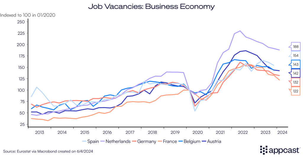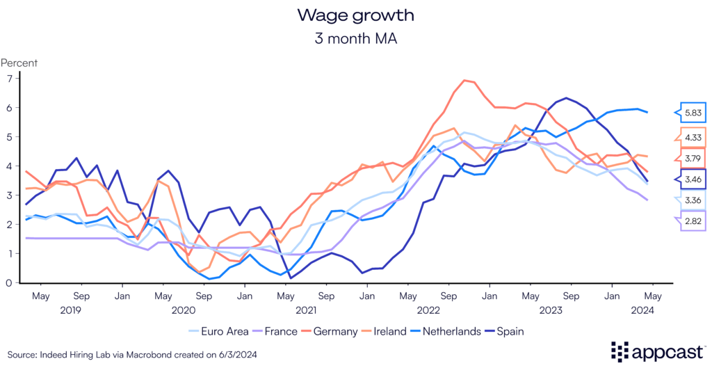 Alternative data points on wage growth are showing a more benign picture. The Indeed tracker shows that wage growth for job postings is normalizing quickly across the Eurozone (with the Netherlands being the notable exception for now).