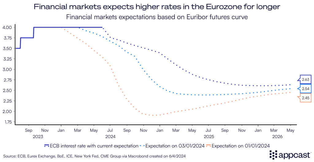 While the ECB seems to be willing to look through the higher wage growth numbers to some extent, financial markets are now pricing in fewer rate hikes throughout 2024 and 2025 compared to the beginning of the year.