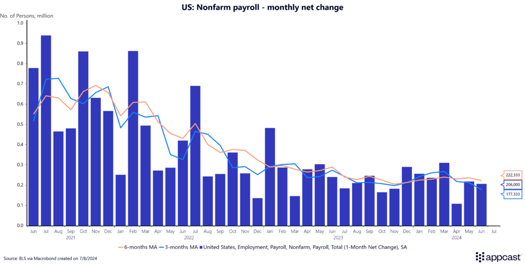 Despite a heat wave stretching across the United States causing scorching temperatures (including Plam Springs hitting 124 degrees!), June’s employment numbers were much cooler. The U.S. economy added 206,000 net new jobs and the unemployment rate increased to 4.1% – the highest since November 2021.