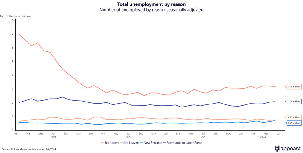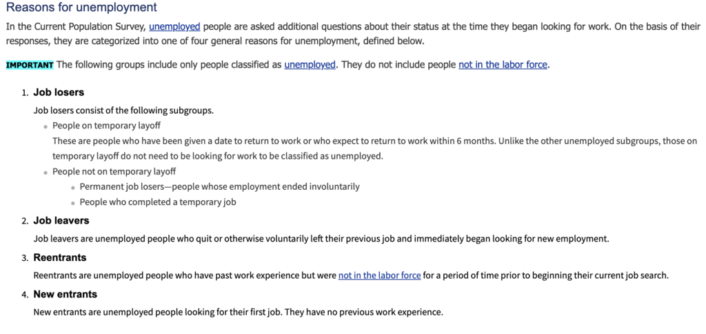 What’s going on with the rising unemployment rate? The Bureau of Labor Statistics has four categories for unemployment reasons: Job Losers (laid off or finished temporary job), Job Leavers (quitting), Reentrants (people of out the workforce looking for work again), and New Entrants (looking for first job).