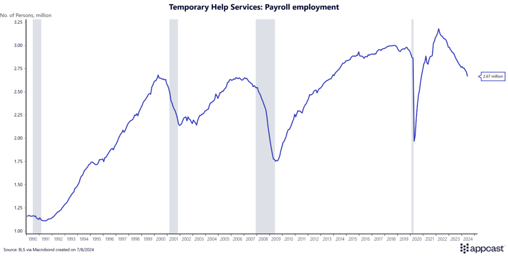 Gains were not broad-based, though. Professional and business services lost 17,000 last month, compared to the three-month average gain of nearly 5,600. The real red flag, though, is the continued decline in the temporary help services sector. In June, temporary help employment declined by 49,000 jobs. Declines like these have historically been a harbinger of recession, but this time may be different. Following the COVID-19 pandemic, employment in temporary help services skyrocketed. Now, they may simply be returning to stability.