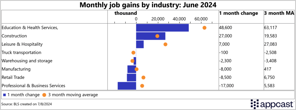 Once again, healthcare added an impressive number of jobs in June, gaining 49,000 net jobs last month. This is lower than the average gains over the last three months in the sector. Other industries that chalked up gains for the month include construction and leisure and hospitality – “standing up” positions that continue to thrive in a slower market.