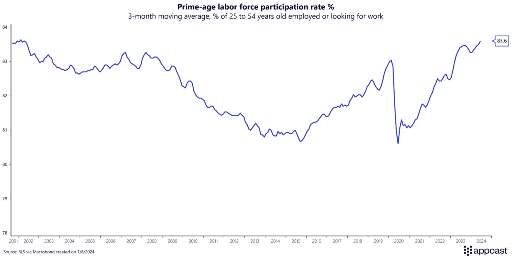 Labor supply continues its upward trajectory, now at 83.7% for workers aged 25-54 years old, just shy of the previous record of 83.8% in May 2001.