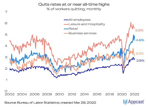 Quits rates are near an all-time high, having reached 3.0% in November of 2021. Interpretations of this “Great Resignation” fall into two camps: some believe there has been a cultural shift where people have a lower willingness to work, while others say it’s a cyclic pattern exhibited during times of quick economic recovery.
