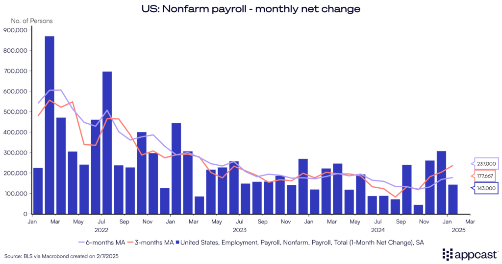 Overall, employment rose by 143,000 in January and the unemployment rate ticked down slightly to 4.0%. So overall the labor market remains in solid shape going into 2025, although the recent past (2023 to 2024) shows a slightly weaker trajectory than before.