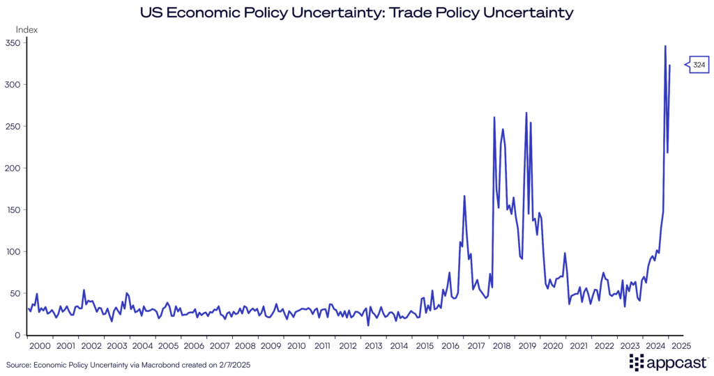 The future is always uncertain, but its particularly hazy for the U.S. labor market at this juncture. President Donald Trump threatened Mexico and Canada with punitive tariffs, before issuing a 30-day delay this week. Additional tariffs on China went into effect, and China retaliated this week. Indicators of trade policy uncertainty have spiked. The lack of clarity on tariffs can itself cause businesses to pull back on investment plans. That would cause job growth throughout this year to suffer, even if the tariffs implemented are rather modest. The theater of negotiating tactics that threaten tariffs is an impediment to job growth.