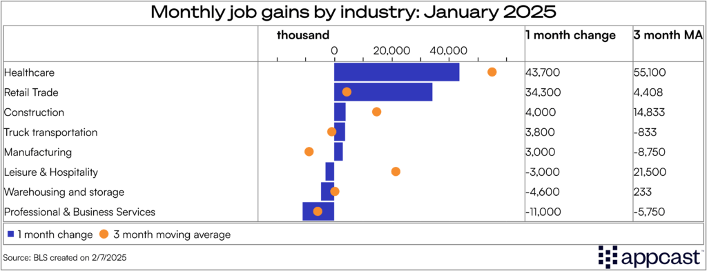 Industry breakdown: The composition of job growth continues to be healthcare heavy. Retail has had a strong few months recently. Job growth was slightly more broad-based in January than it had been in recent months. While that’s a good sign, because labor market growth concentrated in a few industries is perhaps more precarious, the bigger picture is that most industries outside of healthcare are seeing a tapering off in hiring.