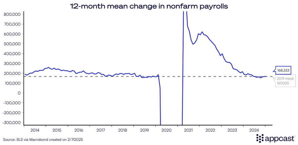 Policy uncertainty aside, the labor market is in near-perfect balance, with a healthy supply of new workers and job gains. The 12-month change in employment exactly matches the 2019 trend.