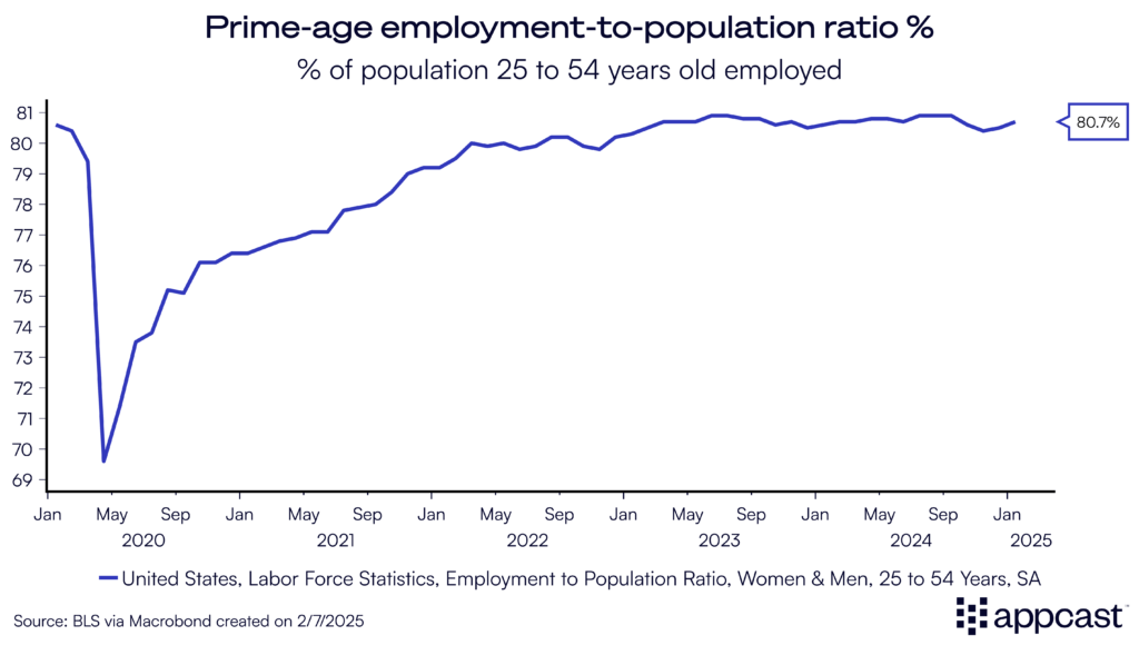 Wonky details: The Current Population Survey (which produces indicators like the total labor force and the unemployment rate) adjusted its population counts with the latest Census population figures. This boosted the reported level of employment by more than two million; however, this jump isn’t driven by a sudden surge in employment. Instead, it reflects an updated estimate of immigration that was previously undercounted.
