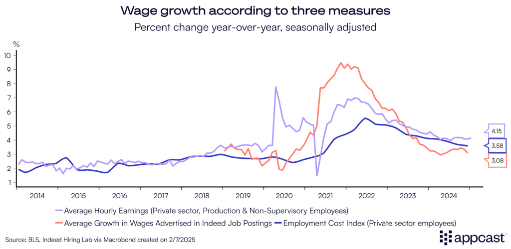 Looking forward, the 2025 labor market is moderating, with a near-perfect balance of job gains and labor force growth. Average monthly job growth over the last three months through January 2025 stands at 237,000, an acceleration from last year’s trend.