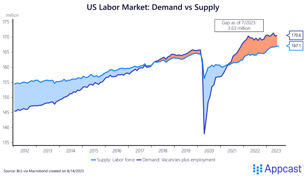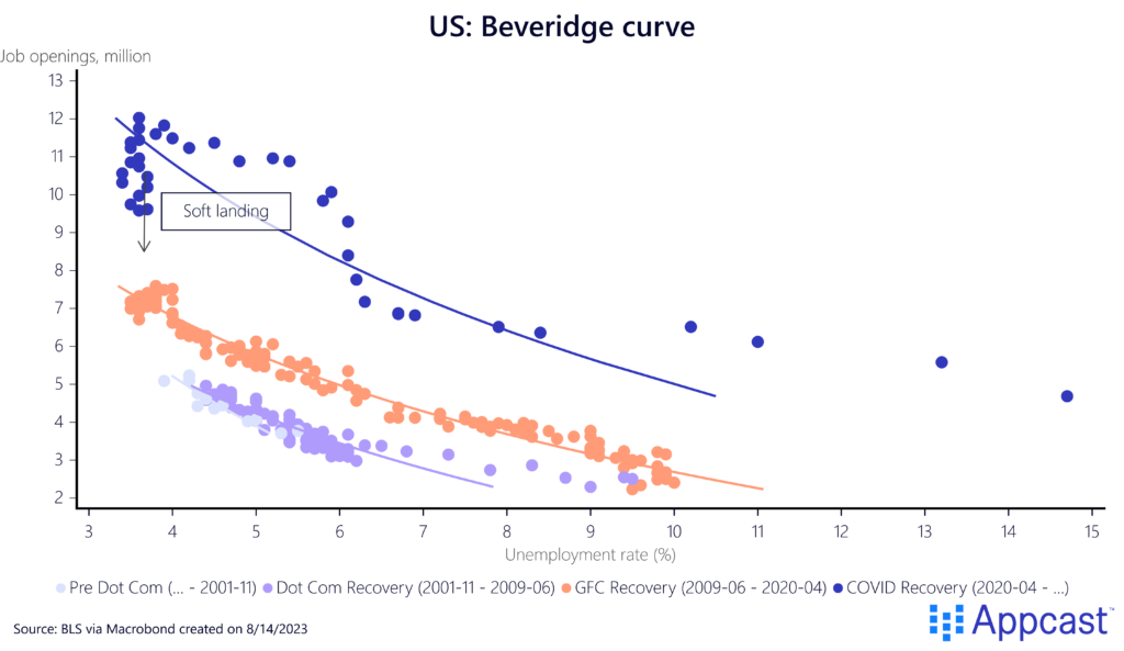 Based on the historical relationship shown above, some economists argued last year that a soft landing would be unlikely. They suggested that the Fed would not be able to bring down vacancies (labor demand) without creating a significant increase in unemployment, thus moving down the Beveridge curve.