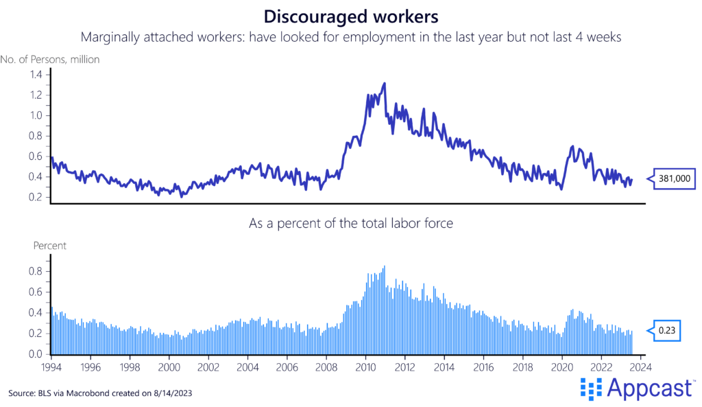 Thanks to the very tight labor market, the total pool of available workers on the sidelines has decreased quite significantly. The unemployment rate has been below 4% for almost two years now. The total number of marginally-attached workers – persons who had been looking for a job over the last year but not over the last four weeks – is also extremely low, especially when being measured as percentage of the total labor force.