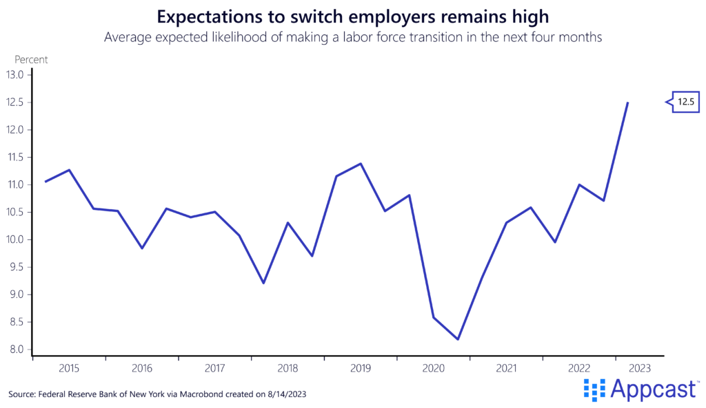 Surveys confirm that this poaching is now happening more frequently than in the past. A consumer survey from the New York Fed shows that expectations of job transitions to a new employer have reached an all-time high of 12.5% in early 2023. This is significantly higher than during the pre-pandemic years when the value fluctuated around 10%.