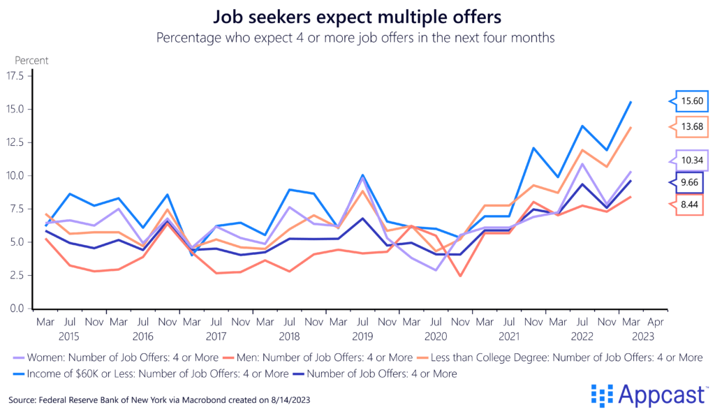 An increasing number of job seekers are reporting that they expect multiple job offers in the near future. The Fed survey shows that the number of job seekers who expect four or more job offers in the next four months has doubled for certain groups: 10% of women and about 8.5% of men expected more than four job offers in early 2023, up from about 7% and 4% in 2019.