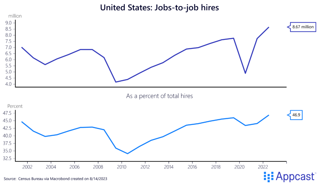 Quarterly job-to-job hires increased to 8.5 million in late 2022; whereas, it was just over 4 million in 2009. As a percentage of total hires, job-to-job transitions increased to a record-high of more than 46%, compared to a low of 34% in 2009.