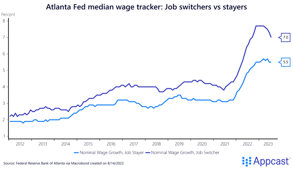 Wage data from the Atlanta Fed shows that switching jobs is also good for your wallet. Wage growth for job switchers has been significantly higher than wage growth for workers who stayed put during the pandemic.