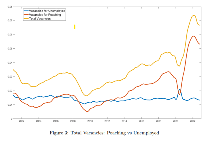 However, a recent paper by the St. Louis Fed disputes this argument. Their model shows that almost the entire increase in vacancies over the last couple of years is the result of an increase in vacancies for poaching rather than vacancies for the unemployed. Ultimately, that means that the Fed could cool down the economy without creating additional unemployment. With a cooling market, businesses would just substantially decrease their poaching vacancies at first, and unemployment would remain low.