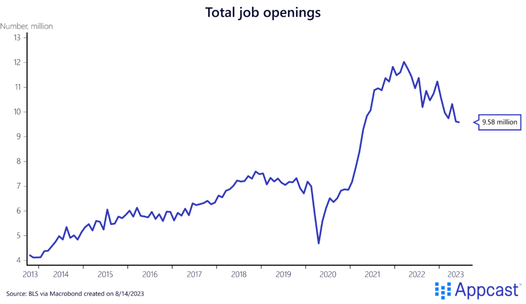 Economists refer to the relationship between the unemployment rate and job openings in the economy as the Beveridge curve. Usually, a higher unemployment rate comes along with lower job openings in a weaker economy, which is why the Beveridge curve is downward sloping.