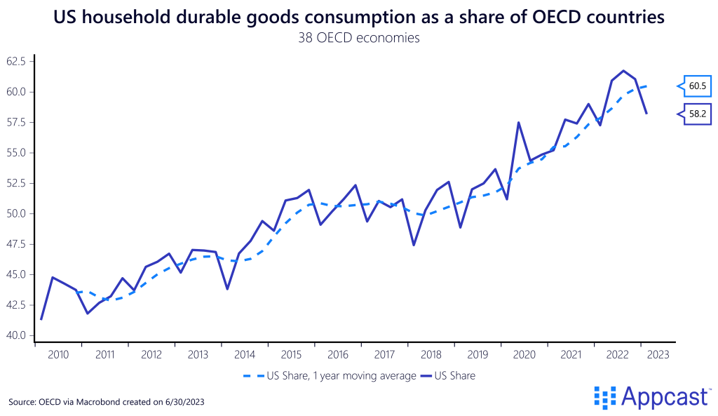 It is fair to say that the U.S. consumer bailed out the world economy again. U.S. household consumption on durable goods as a share of all OECD durable goods consumption increased from about 50% pre-pandemic to now more than 60%. While part of this increase is due to the recent strengthening of the U.S. dollar (an exchange rate effect), the strong greenback itself is side-effect of U.S. economic outperformance vis-à-vis the rest of the world. Since early 2020, the largest share of the increase in global goods consumption comes from American household spending.