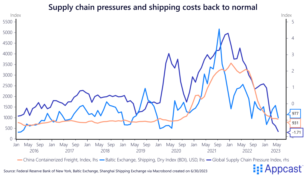 As global demand has noticeably cooled down, supply chains across the globe have normalized as well. While the shutdowns in response to the pandemic led to an interruption in supply chains in 2020 and early 2021, the researchers at the New York Fed who constructed the global supply chain pressure index observed that a large part of the surge thereafter was rather the result of rising global demand.